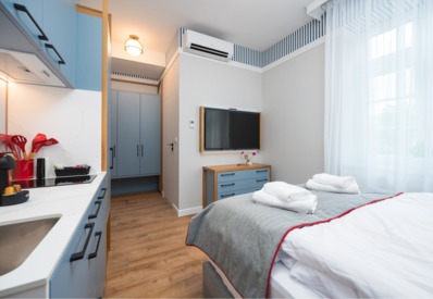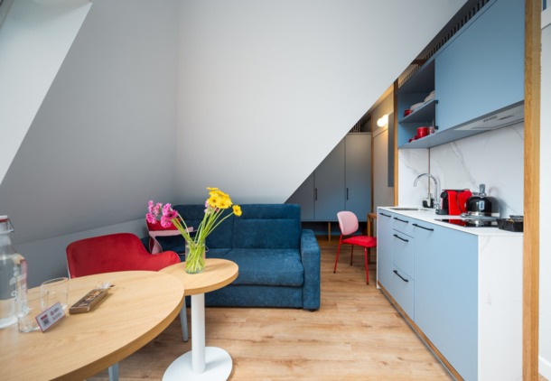 - salon z rozkładaną kanapą, która może pełnić funkcję dodatkowego miejsca do spania.